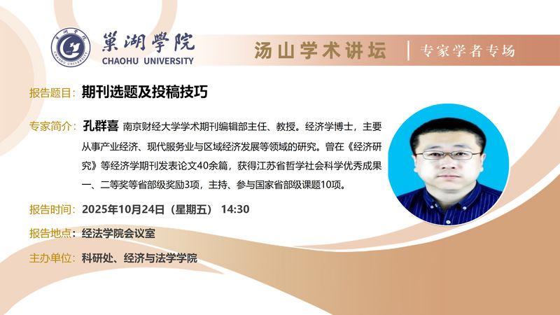 • 10月24日:南京財經大學學術期刊編輯部主任孔群喜教授講座